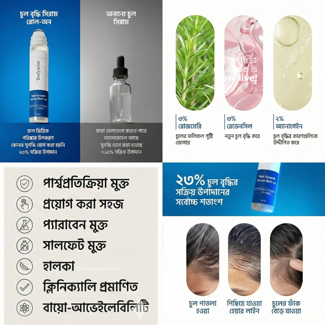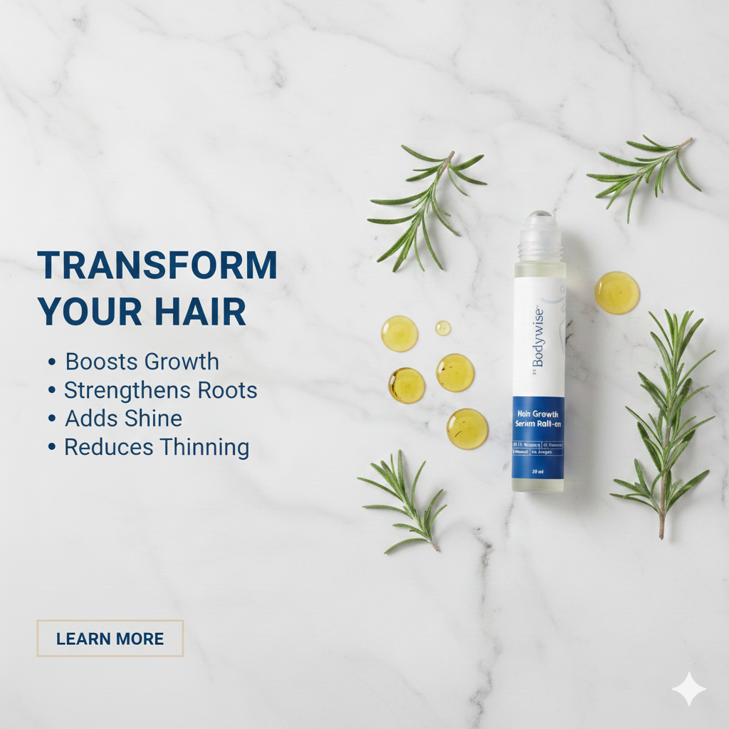 চুল পড়া, ধীর গতি, পাতলা চুল—এ সমস্যা এখন খুবই সাধারণ। এসব সমস্যা সমাধান করতে Bodywise Hair Growth Serum Roll-On নিয়ে এসেছে ডার্মাটোলজিস্ট-ব্যাকড এক বিশেষ সমাধান। রোজমেরি এক্সট্র্যাক্ট এবং হেয়ার-ফ্রেন্ডলি ন্যাচারাল অয়েলসমৃদ্ধ এই সেরাম চুলের ফলিকলকে সক্রিয় করে নতুন চুল গজাতে সাহায্য করে এবং পাতলা চুল ঘন করতে ভূমিকা রাখে।